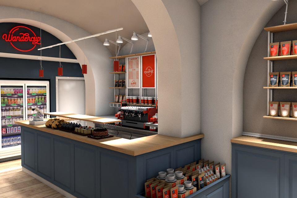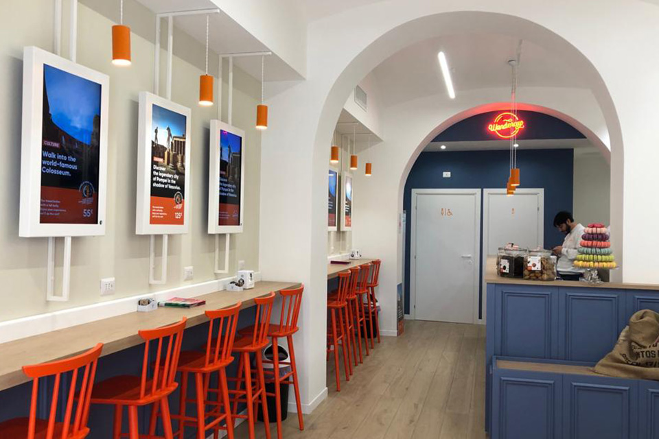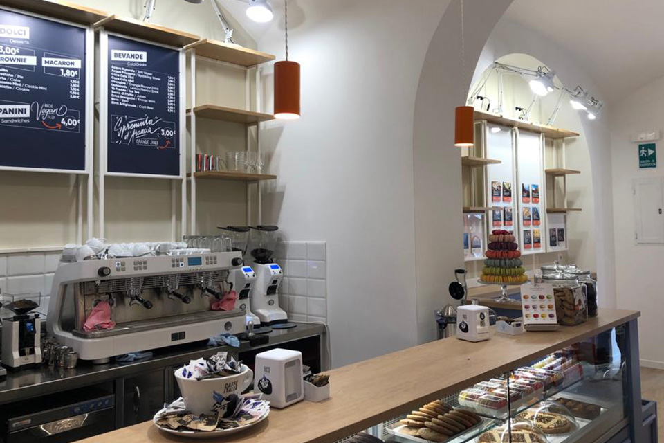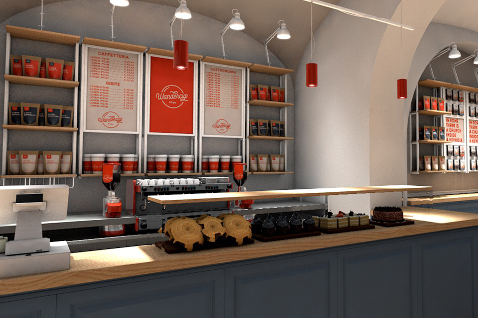 Caffè pensato per turisti, con accessori e guide dedicate, boiserie in legno e bancone-vetrina, il tutto come da progetto!